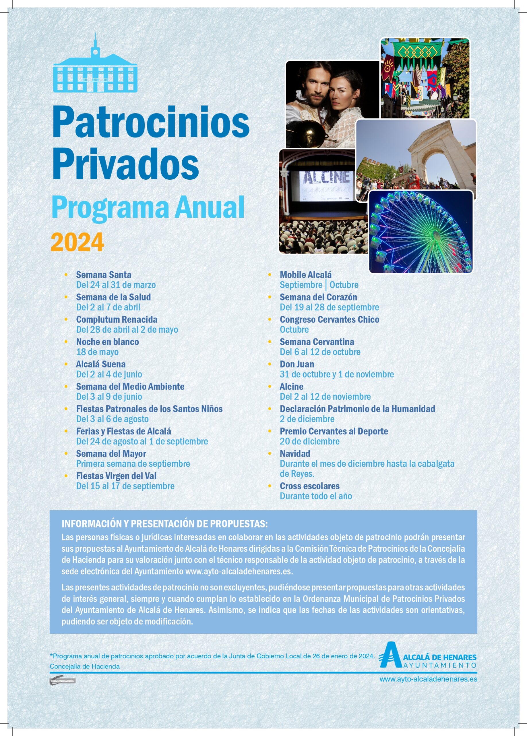 La Ordenanza Reguladora de los Patrocinios Privados de actividades municipales del Ayuntamiento de Alcalá de Henares fue publicada en el BOCM el 29 de abril de 2015. En su artículo 14.1 detalla que “en el mes de enero de cada año, la Junta de Gobierno Local aprobará el Programa Anual de Patrocinios de la Ciudad de Alcalá de Henares, en el que se incluirán todas las actividades que puedan ser patrocinadas durante el año”.