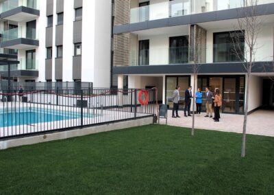 Una visita que también ha contado con la presencia de Iván Pascual, Delegado de AEDAS Homes en Centro, y la Gerente del Proyecto, Candela Cepedano, entre otros. Durante la misma la comitiva ha acompañado a una joven pareja que recibían las llaves de su nueva vivienda, en la nueva Urbanización que se alza como una promoción adaptada 100% a los nuevos tiempos y a las necesidades de la demanda: la urbanización, que acoge en total 155 viviendas de todo tipo y superficies (2, 3 y 4 dormitorios) con grandes salones, terraza, garaje y trastero, y que ofrece completas zonas comunes con piscina, un área verde en forma de pradera, pista de pádel, espacio para juegos infantiles, sala de comunidad y una segunda sala coworking perfecta para que los residentes puedan teletrabajar en un espacio adaptado.
