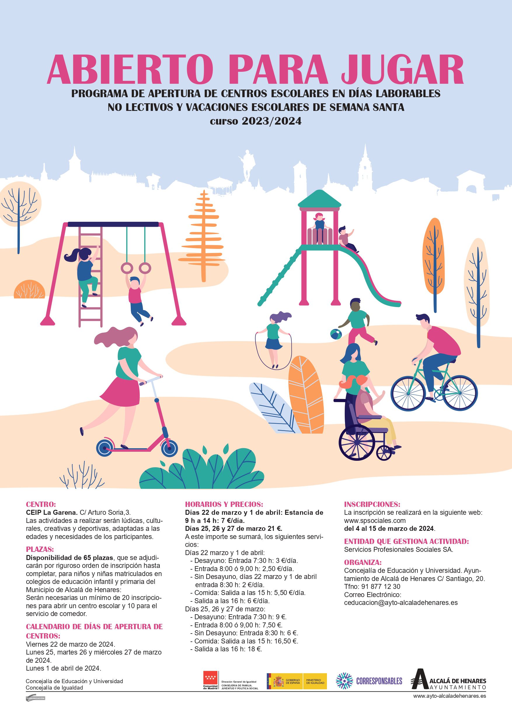 La Concejalía de Educación informa de que los próximos días viernes 22, lunes 25, martes 26 y miércoles 27 de marzo y lunes 1 de abril de 2024, no lectivos en el calendario escolar, el CEIP La Garena abrirá sus puertas en el marco del programa “Abierto para Jugar”.