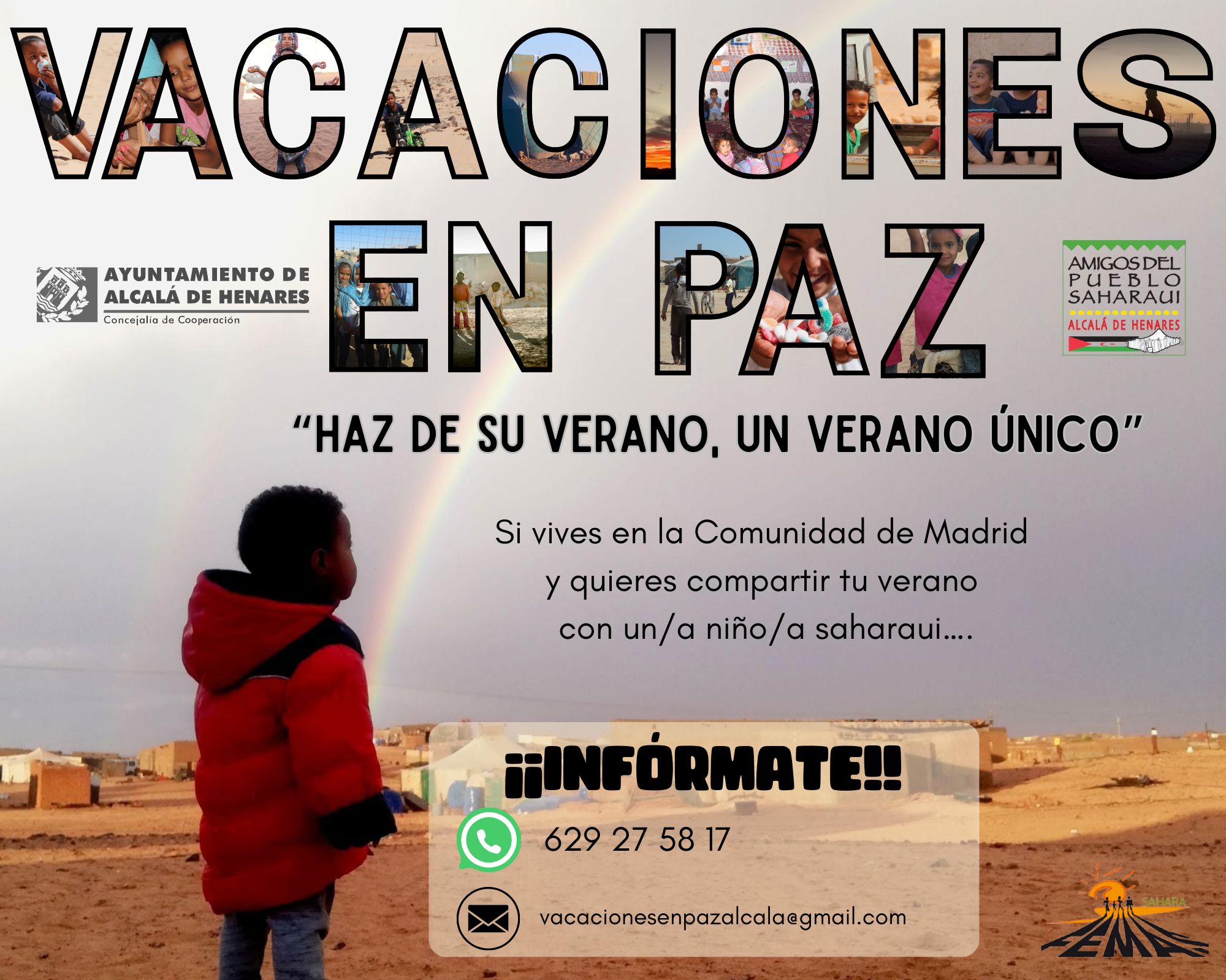Con el programa de Vacaciones en Paz se hace posible que, durante los dos meses de verano, julio y agosto, un grupo de niños y niñas saharauis de los campamentos de Refugiados en Tinduf, Argelia, sean acogidos de manera temporal por familias que viven en Alcalá. Las familias interesadas en acoger a estos niños y niñas pueden ponerse en contacto con la asociación a través de email (vacacionesenpazalcala@gmail.com) o en el whatsapp 629275817.