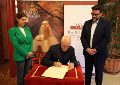 Posteriormente, Luis Mateo Díez, que también ha firmado el Libro de Honor del Teatro Salón Cervantes, ha asistido a la representación de la función ‘Retorno al Celama’, programada este viernes en homenaje al Premio Cervantes. Se trata de un insólito espectáculo que se adentra en el realismo mágico de las novelas del autor.
