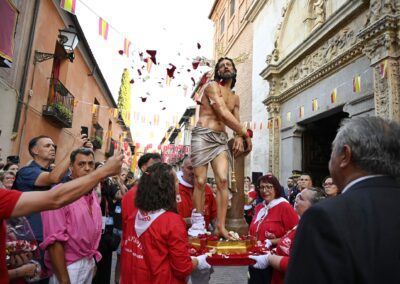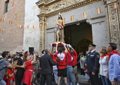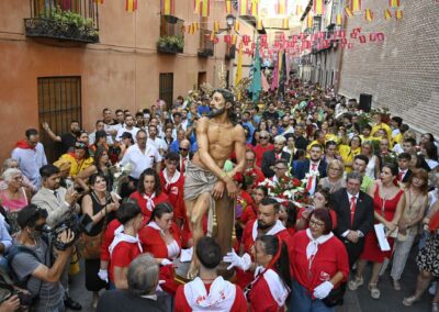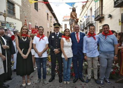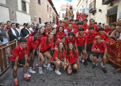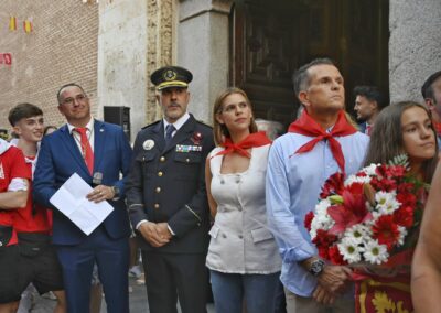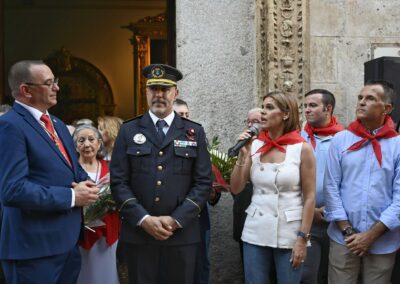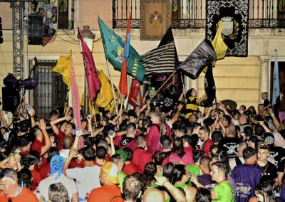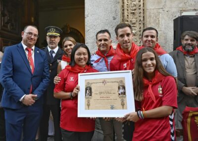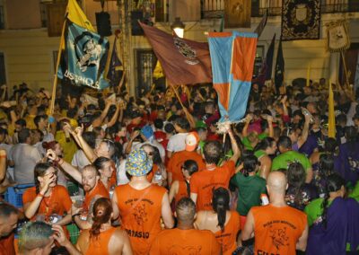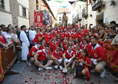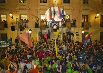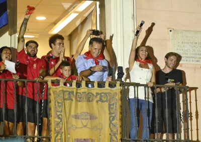 Seguidamente, las peñas festivas han tomado el protagonismo colocando su estandarte en el balcón del Ayuntamiento, donde permanecerá hasta el próximo domingo día 1 de septiembre, cuando se procederá a su retirada al finalizar el desfile de carrozas.
