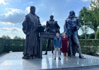 En el año 2016, con motivo del cuarto centenario de la muerte de los tres autores, la ciudad de Fuzhóu inauguró un monumento en homenaje a Cervantes, Shakespeare y Tang Xianzu en uno de los parques más bellos de la ciudad. Este monumento, ya inaugurado y visitado por representantes de Fuzhóu y Stratford, era uno de los puntos más simbólicos del programa previsto para la delegación alcalaína, ya que, al visitarlo, se ha completado definitivamente el proceso de inauguración al contar así con la presencia de las tres delegaciones de las tres ciudades natales de estos escritores.