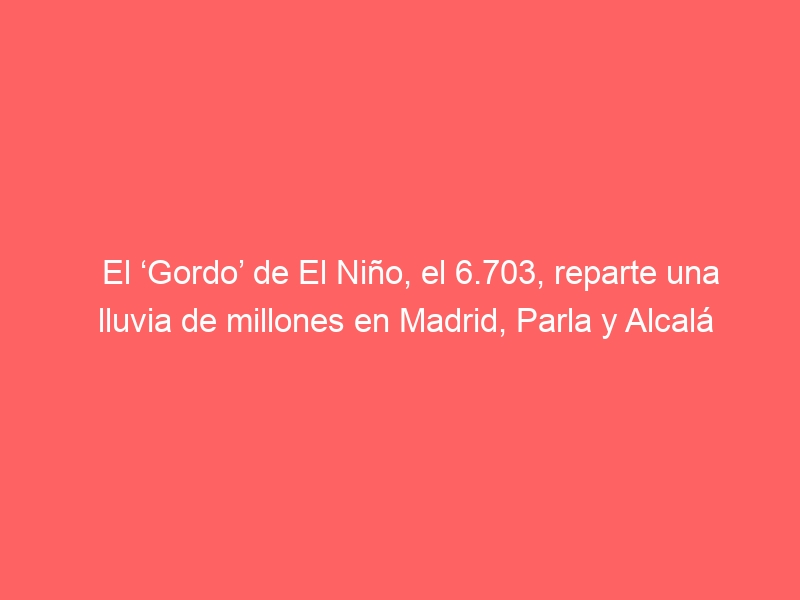 El número 6.703, que ha sido agraciado con el ‘Gordo’ del Sorteo Extraordinario de ‘El Niño’ 2026 -dotado con dos millones de euros por serie, es decir, 200.000 euros al décimo agraciado-, ha sido vendido en la capital y en las localidades de Alcalá de Henares, Parla, San Lorenzo de El Escorial y El Álamo.